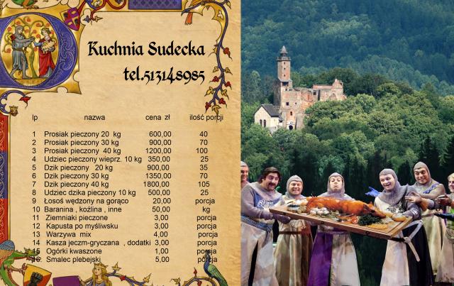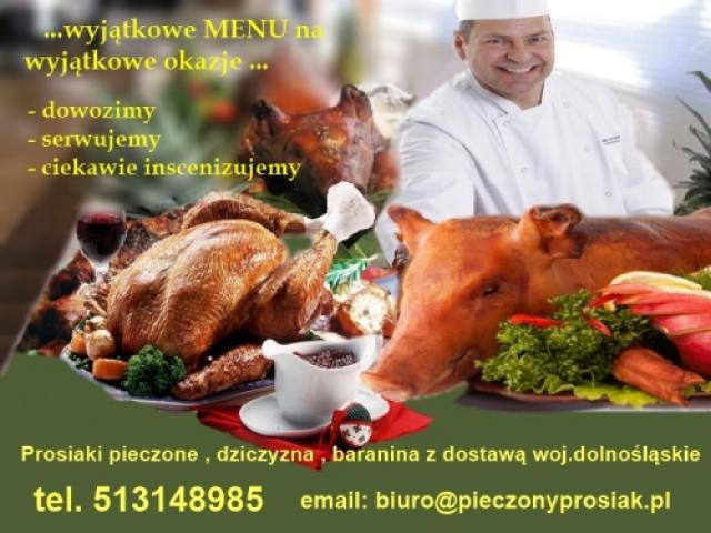 Dzik , baran lub prosiak pieczony – wyjątkowe MENU na wyjątkowe okazje - wesela , spotkania , uroczystości. Możliwość dostawy na gorąco w woj.dolnośląskim , porcjowania oraz oprawy artystycznej w klimacie średniowiecza ( pokaz walki rycerskiej ), lub myśliwskiej . W zależności od klimatu spotkania dostarczymy catering z potrawami do uzgodnienia.